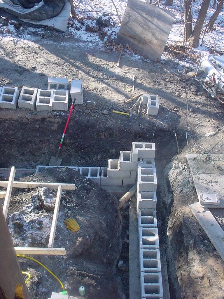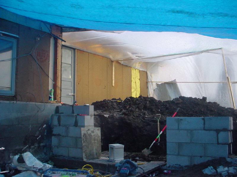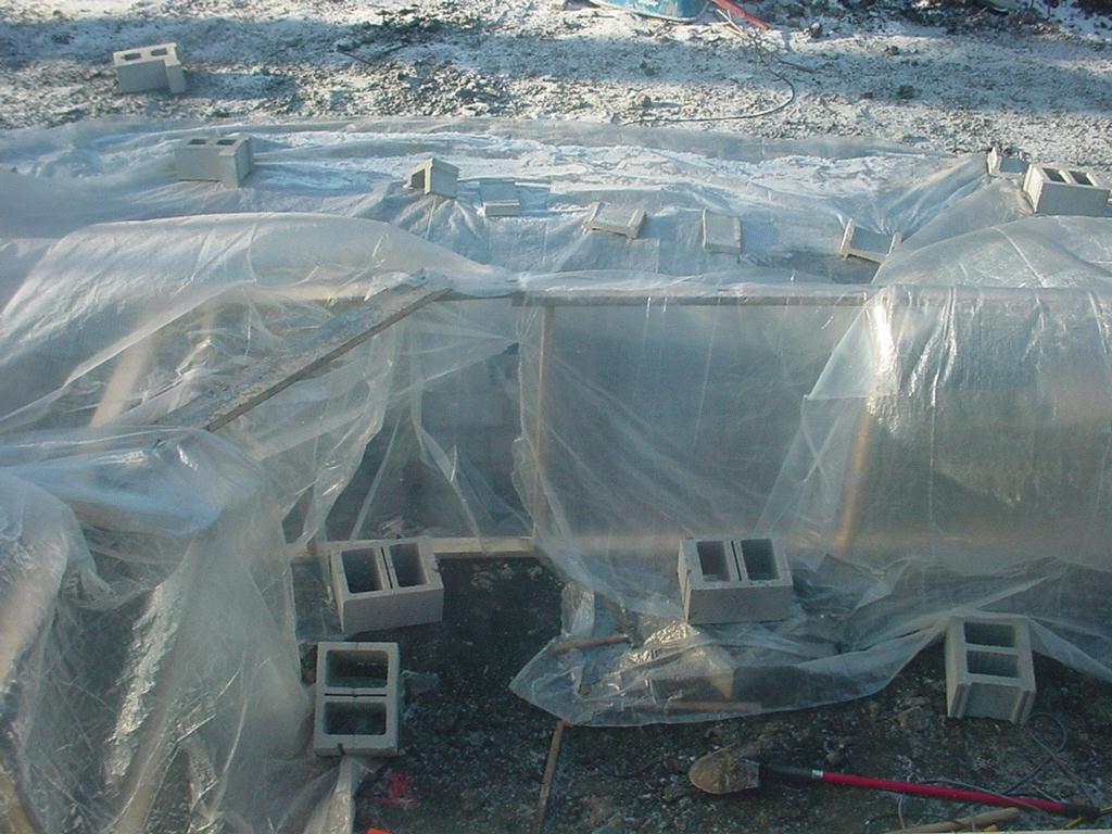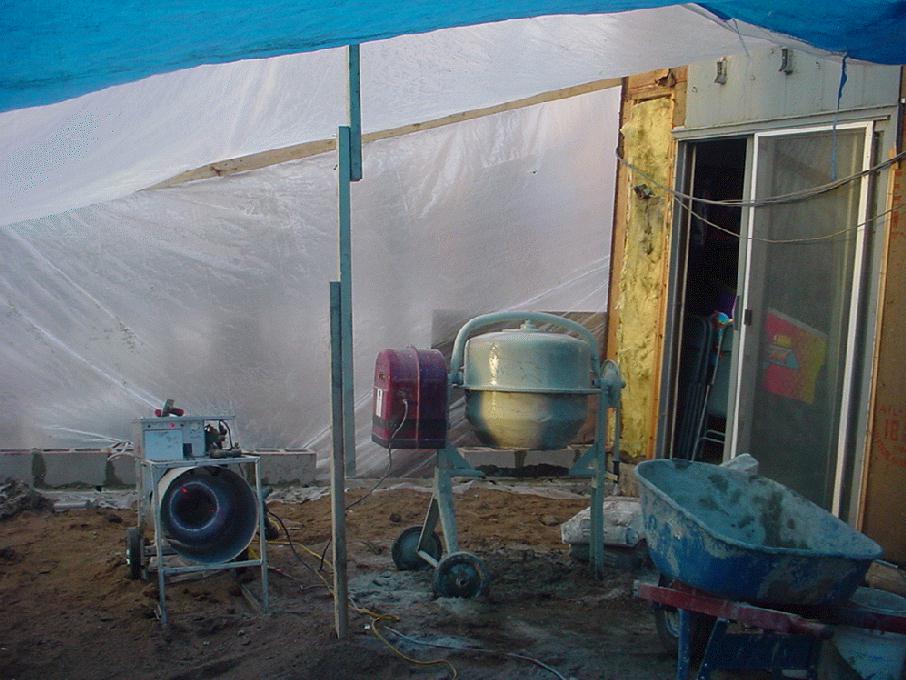 After the block work, they had to cover the blocks and put a heater in the trench so the cement would cure. The